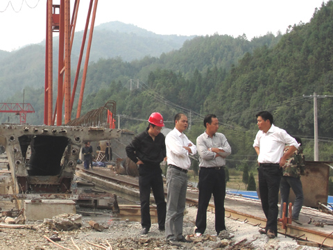 丁处长在大梁预制现场听取项目经理汇报