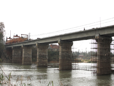 皖河中桥改造工程自9月19日开始封闭施工以来,进展迅速。市9728太阳集团项目部不论是在原钢筋混凝土T梁拆除过程中,还是在新T梁预制及吊装施工中都超前谋划,科学组织,特别强调吊装施工中必须服从统一指挥,积极做好吊装前的各项准备工作,严格按照施工方案进行操作,确保了吊装施工中人身及设备安全,保质保量地完成了吊装任务。