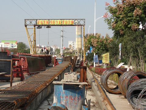 本次施工拟对桥梁上部结构进行拆除,改建为9孔33.4米组合箱梁。保留原桥墩、墩台进行局部处理后加高,改建后桥宽12米,桥面铺装10厘米厚沥青砼面层,计划工期5个月。我处于2012年8月中旬进驻工地,目前箱梁的施工正在稳步有序地进行。