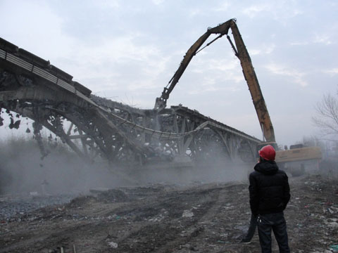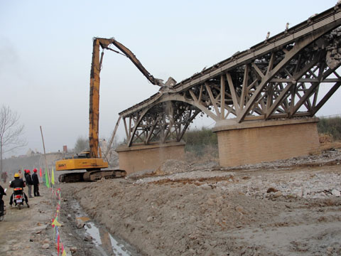 由于该桥属于危桥,拆除难度大,河床和桥梁结构比较复杂,鉴于现场实际情况和对拆除安全的重要性,我处采用国内目前最先进的大型拆除设备——自动液压钳进行现场拆除,并成立大桥拆除应急预案小组及安全领导小组确保此次拆桥顺利完成。