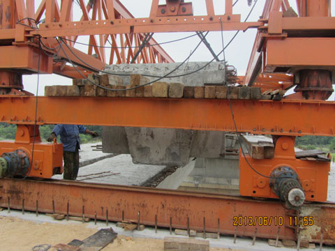 潜山车轴寺大桥改造工程自3月9日封闭施工以来,工程进展迅速。箱梁于4月15日开始架设,一共 9跨36片。施工期间,由于潜山当地连降暴雨,造成山洪暴发,将项目部为方便当地人通行而建的钢便桥冲断,给工程施工造成了极大的困扰。项目部面对困难,精心组织、科学施工,严把质量关,狠抓安全生产,积极调动项目部的一切人力物力,确保了车轴寺大桥吊装施工的顺利完成。