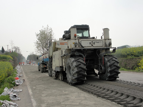 该项目本着节约、环保、降耗的原则,采用沥青路面就地冷再生的技术对该路段的旧沥青面层进行施工。即充分利用现有沥青道路旧铺层材料,必要时加入部分新骨料,并按比例加入一定量的水泥等添加剂,在自然环境温度下就地连续地完成材料的铣刨、破碎、拌和、整平及压实成型,从而修筑出具有所需性能质量的新基层。该工序简单、成本较低、不中断交通、生产效率高、质量控制精准,还能保护环境和资源。