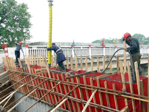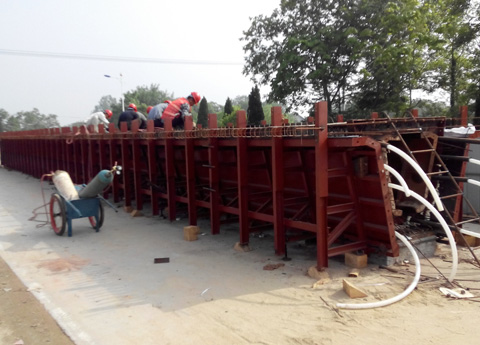 该工程项目由9728太阳集团承建,于2014年12月底开工,项目部积极谋划,精心组织,已完成老桥的拆除工作和新桥钻孔桩基础、6根立柱、2个盖梁、1个桥台的施工,现正在进行梁片的浇筑和另一个盖梁及桥台的施工,截至目前已累计完成工程量250余万元,该改建工程计划于2015年10月完工。