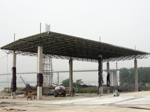 8月15日下午,G206东门汽车码头的罩棚网架结构工程在四台起重机的轰鸣声中顺利完成吊装。