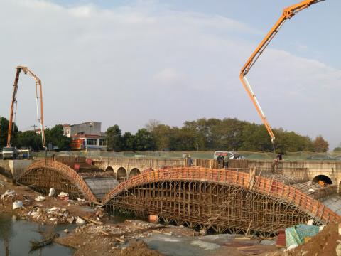 11月18日,在各方的大力支持与配合以及项目部人员的不懈努力下,高河大桥右幅两跨主拱圈顺利浇筑完成。G206怀宁县高河大桥,主拱圈拱轴线为悬链线无铰拱,计算跨径30.0米,矢跨比1/6,拱肋截面为实腹式,肋厚1.0米,主拱圈宽6.53米,采用钢筋混凝土结构,施工工艺复杂。