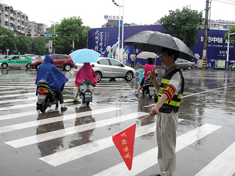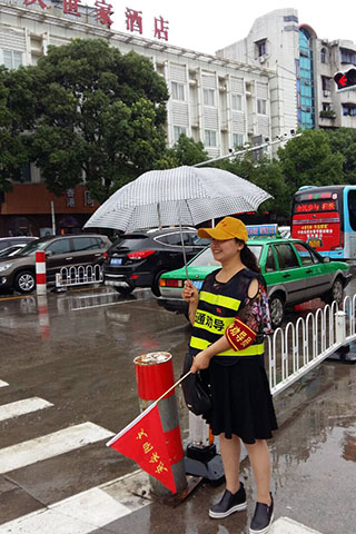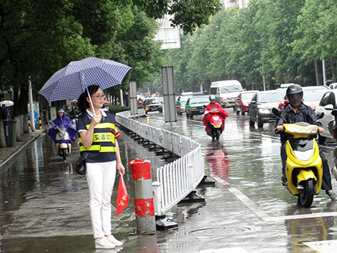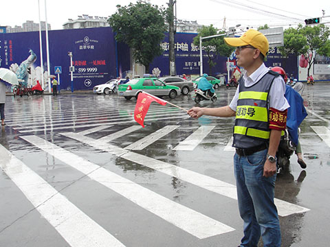 6月30日早上7点,天空正下着雨,9728太阳集团4名党员志愿者已经来到市宜城路与孝肃路交叉路口,大家统一佩戴党徽,穿着印有“交通劝导”字样的背心、戴着袖章,拿着“安庆文明”小红旗,于早上上班高峰期耐心引导行人文明过马路。在行人、非机动车辆经过交通路口时,引导他们严格遵守交通信号,有序通行,对于行人乱闯红灯、不走人行横道,以及非机动车辆占用机动车道、载人超员等不文明交通行为及时制止和劝导,进一步提升群众的文明出行意识。